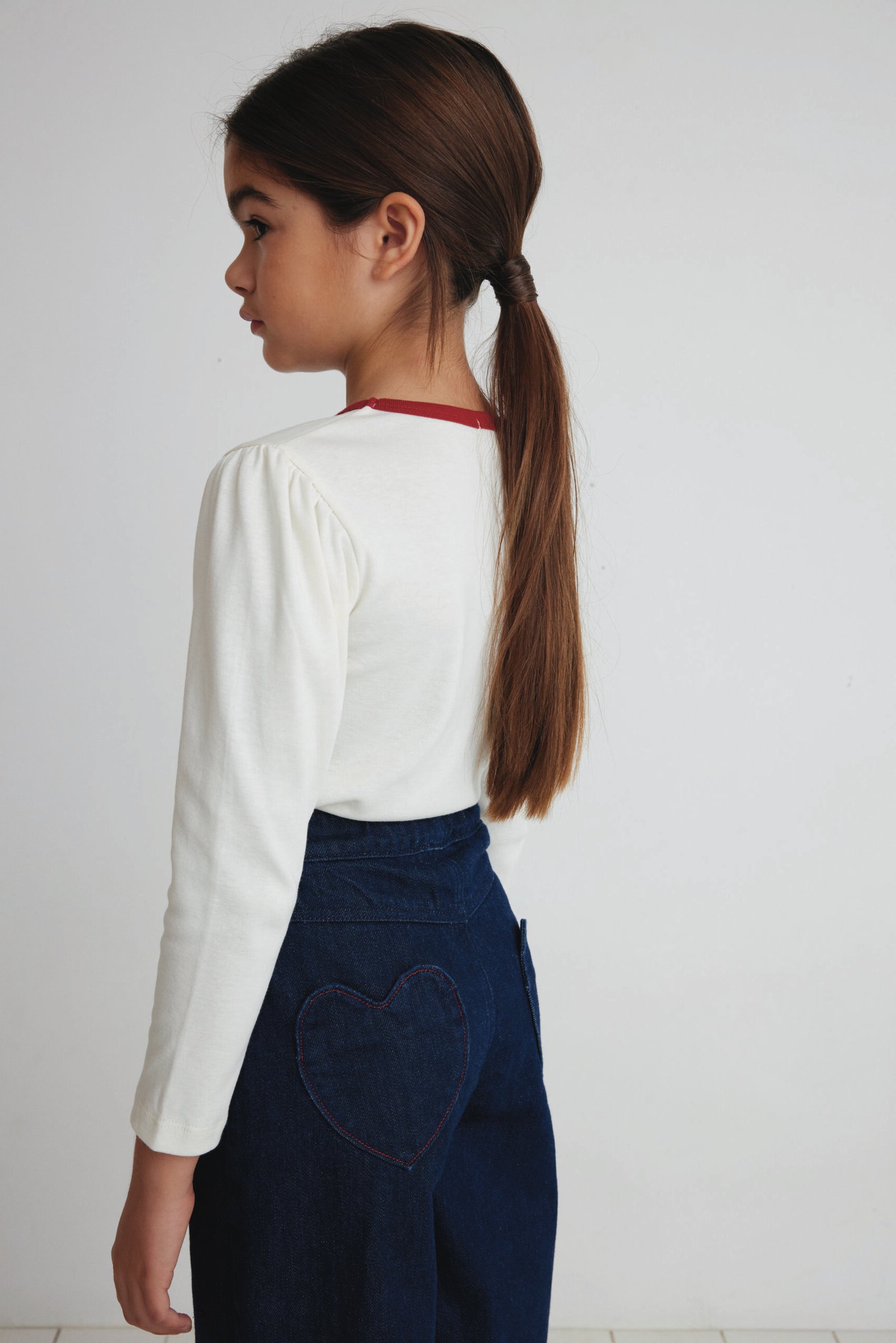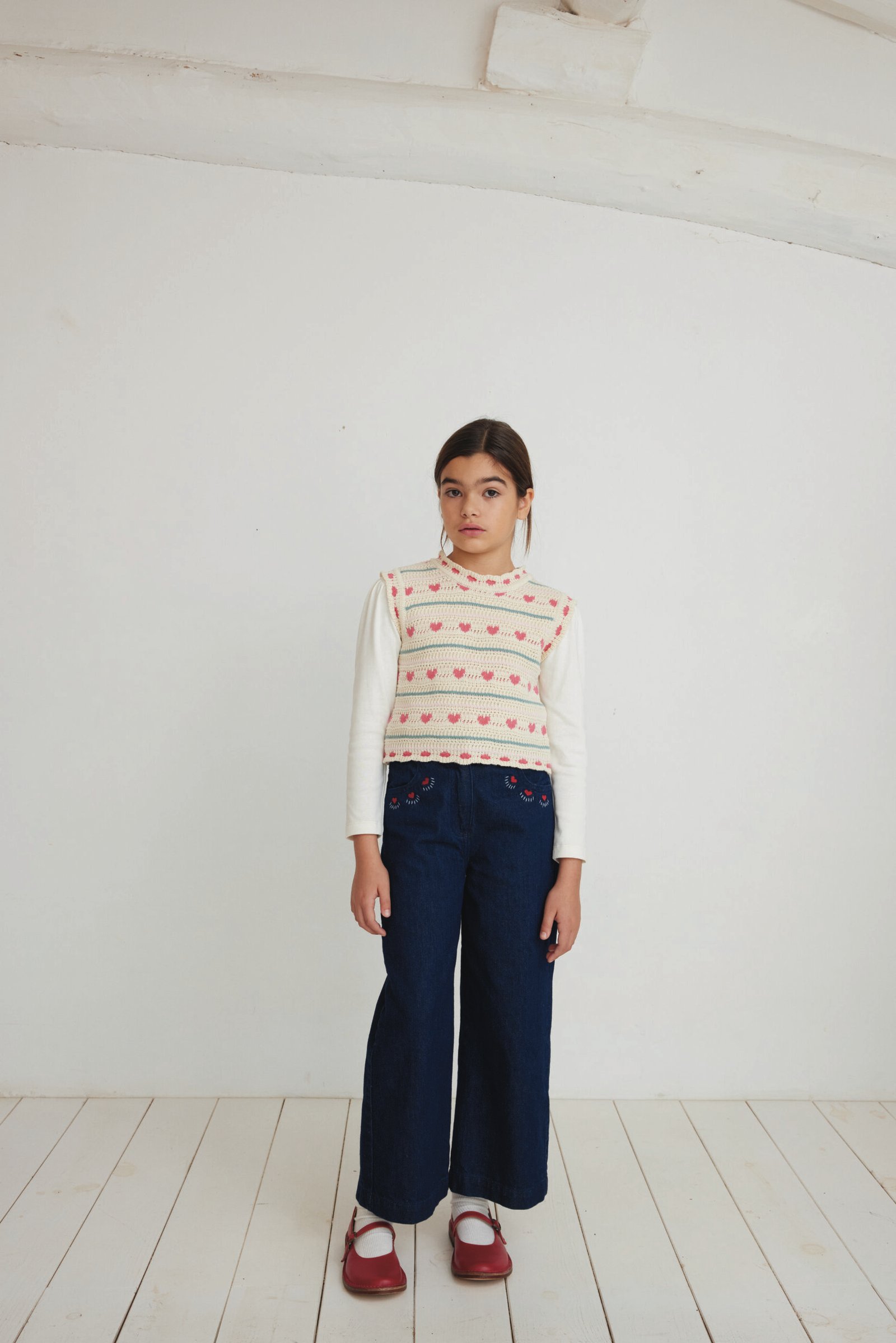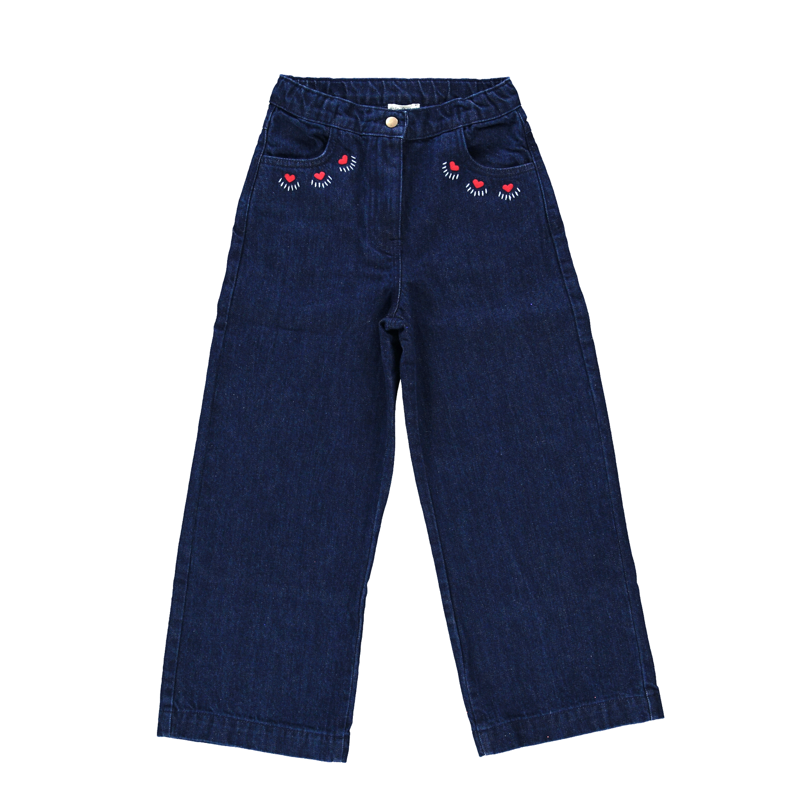 Plataus kirpimo džinsinės kelnės mergaitei yra pasiūtos iš 100 % organinės medvilnės ir pasižymi itin gražia, sodria mėlyna spalva. Tampri juosmens juosta užtikrina visapusišką komfortą, o širdelės formos kišenės gale bei subtilūs siuvinėjimai suteikia neprilygstamo žavesio ir išskirtinumo.